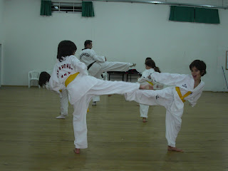 Em segundo lugar, fazemos referência ao nosso Kiosonin que se esforça para manter duas classes de Taekwondo: uma júnior/sénior e uma infantil, que a última só temos a dizer que, só vendo! Estão todos de parabéns. E de facto saudamos agora de modo diferente dois dos nossos colegas. Dois guerreiros (e até três...) atingiram uma nova etapa: No passado Domingo, em Ferreira de Alentejo, o Nuno e o Luís foram a um estágio onde se graduaram para 4º Kup (cinto vermelho). Estão a evoluir continuamente e resta-nos agora mostrar a nossa cortesia e felicidade.